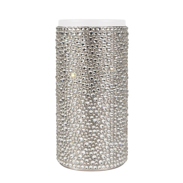 Este aislante de acero inoxidable no solo mantiene las bebidas frías, sino que también aporta un toque de glamour con relucientes cristales de strass de vidrio que adornan el exterior.