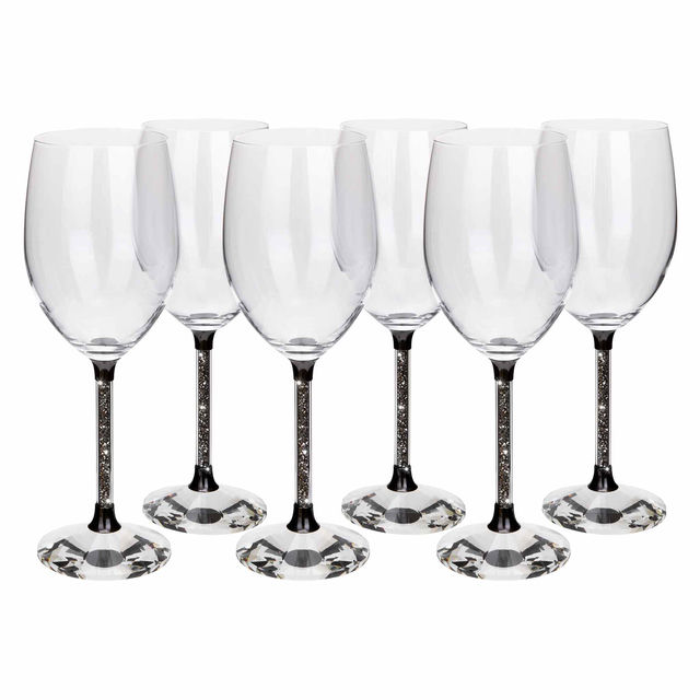 Crafted from high-quality crystal, each glass features a faceted base that catches the light beautifully while the stem is filled with sparkling glass rhinestones in your choice of silver, gold, charcoal, or rose gold.