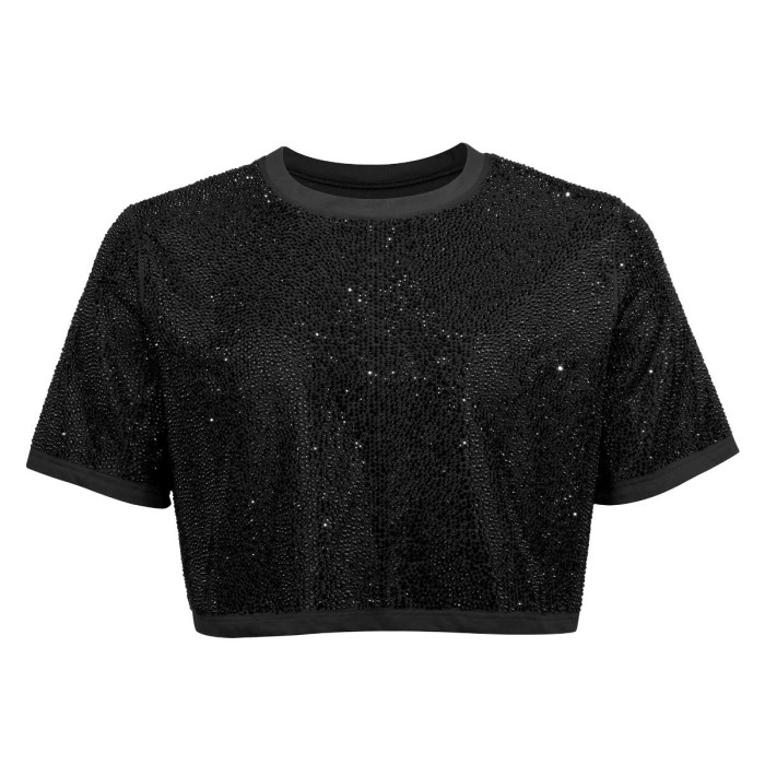Black cropped top covered in rhinestones with short sleeves and a black ribbed neckline. Black cropped top covered in rhinestones with short sleeves and a black ribbed neckline.