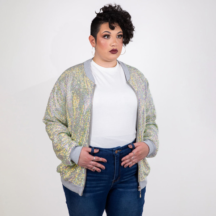 The Rhinestone Bomber Jacket from Sparkles Studio is a showstopping piece with thousands of radiant glass rhinestones. It is made from a comfortable cotton blend exterior, moisture-wicking polyester lining, and sturdy metal zipper. The jacket is durable and easy to care for, making it a one-of-a-kind creation that allows you to express your unique sense of style. To find the perfect fit, please visit our sizing chart.